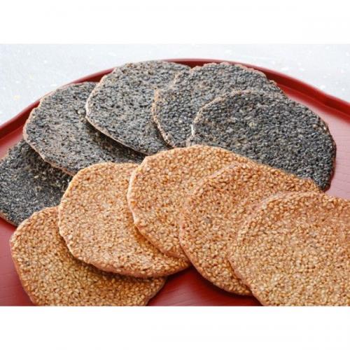 手焼きの洋風胡麻せんべい。とにかく軽い歯ざわりと胡麻の香ばしさが特徴。福島、ご当地の人気の一品です。